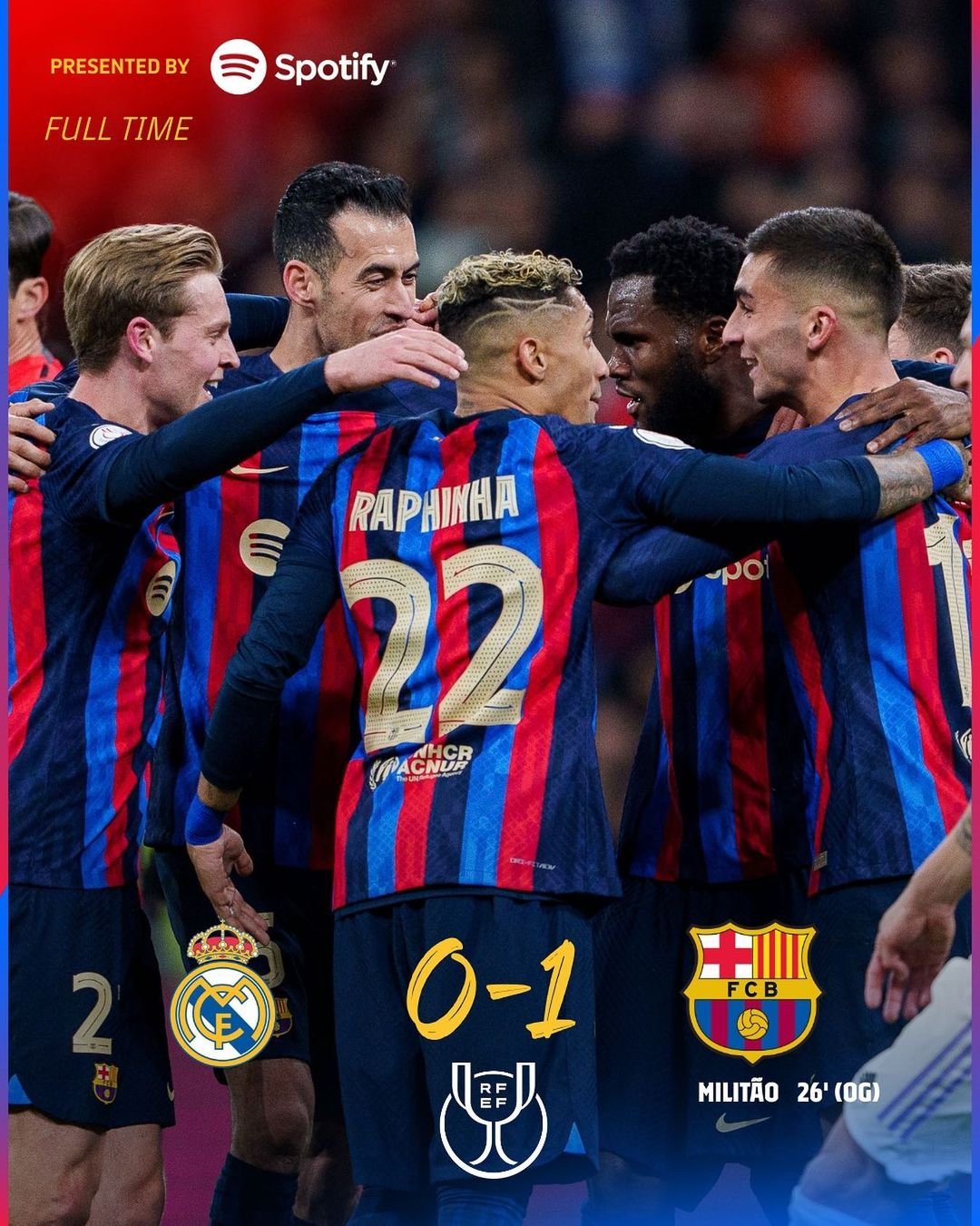 Con un error que le costó la victoria a los merengues, Eder Militao anotaría un gol en su propia puerta que le permitiría al Barça tomar la ventaja del encuentro, misma que supo aprovechar y elongar hasta el final del mismo haciéndose con el triunfo en casa de los madridistas, sellando de esta forma su visita al Bernabéu, y a la espera de recibir en casa el duelo de vuelta.