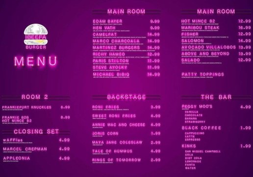 IBEEFA BURGUER ofrece un menú donde literalmente, puedes pedir a tu artista favorito en tu mesa, y es que los nombres de las hamburguesas van desde Above and Beyond, Edam Bayer, Salomon, Fisher, waFFLES, entre otros. Del lado botanero, podemos encontrar en el menú platillos como: Nacheo Plex, Roni Fries o Tales Hummus, un menú bastante curioso.